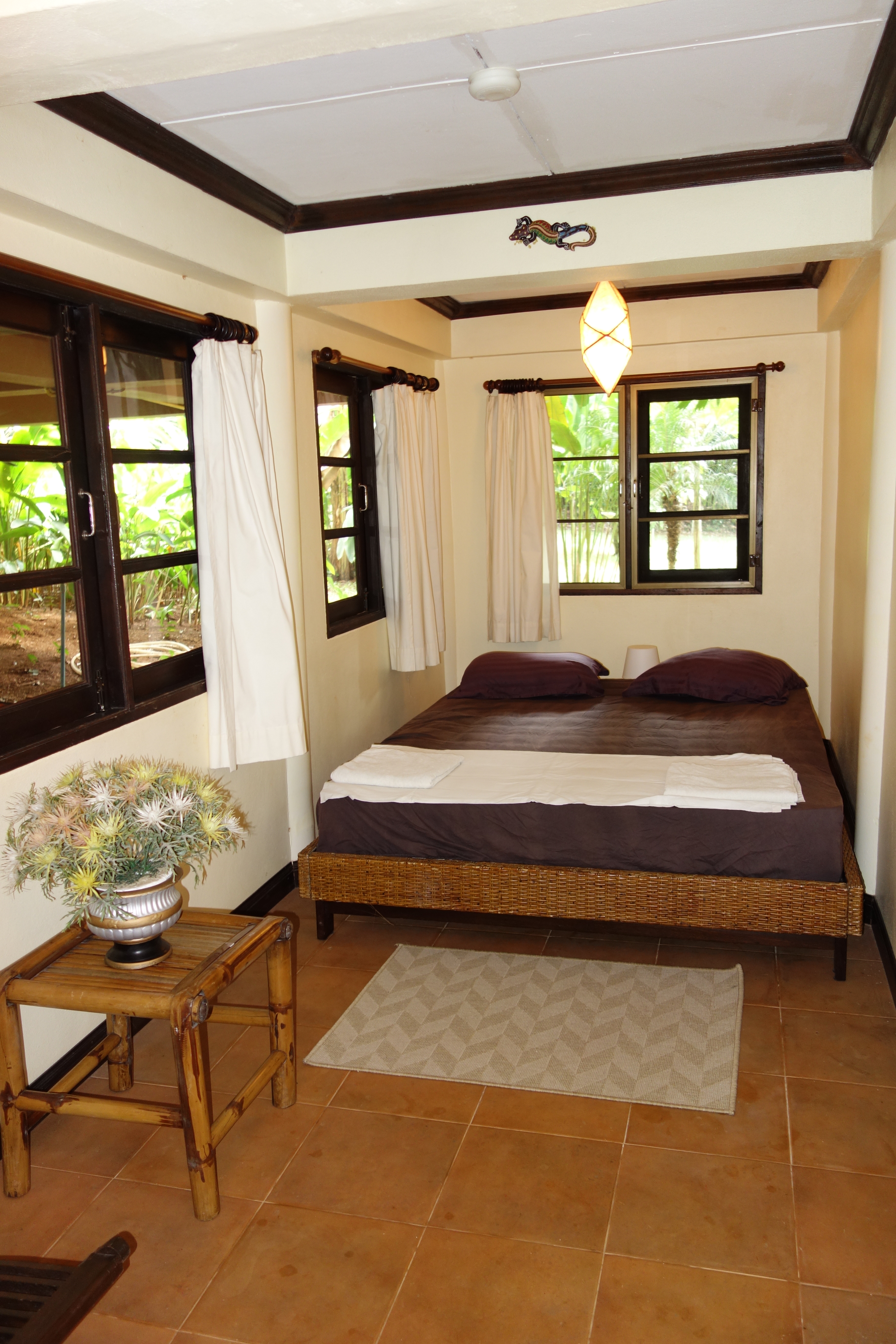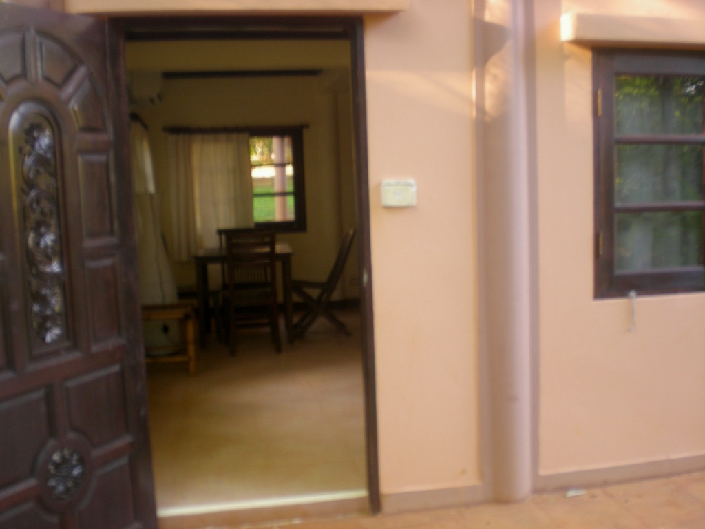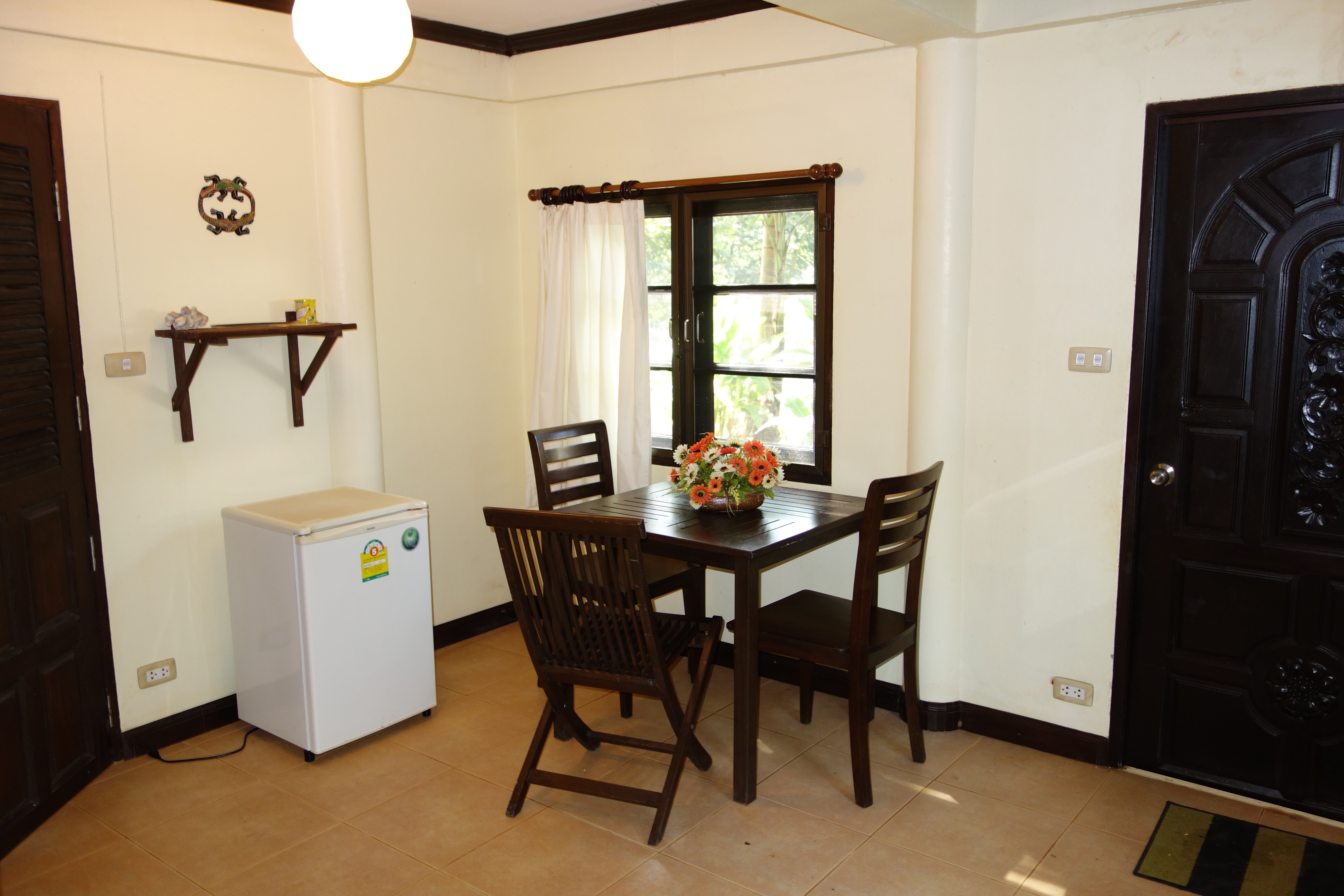 Furnitures are: table and chairs, a large cabinet with lockable shelves, suitcase reck, cloth hangers and a small refrigerator.