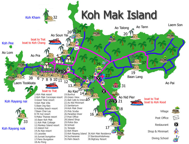 Although the island is still quite unknown it provides a good infrastructure and connection to the main-land, the new airport of Trad is only 30 km away from the pier of Laem Ngob, flying time to Bangkok is only 50 minutes (www.bangkokair.com). Alternativly one of the coaches will bring you to Trat or Laem Ngop, taking about 5-6 hours on the newly built highway. There are ferry and speedboat connections to Koh Mak. The island has 24 hour electric power supply and also phone and Internet connection (Wireless LAN optional).